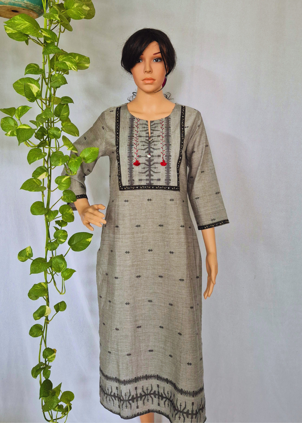 Introducing our exquisite grey handloom designer Kurta for women, office and regular wear, ensuring you exude professionalism and style effortlessly. Crafted from handloom cotton fabric, this kurta promises unparalleled comfort and ease of maintenance and friendly fit for all body type.