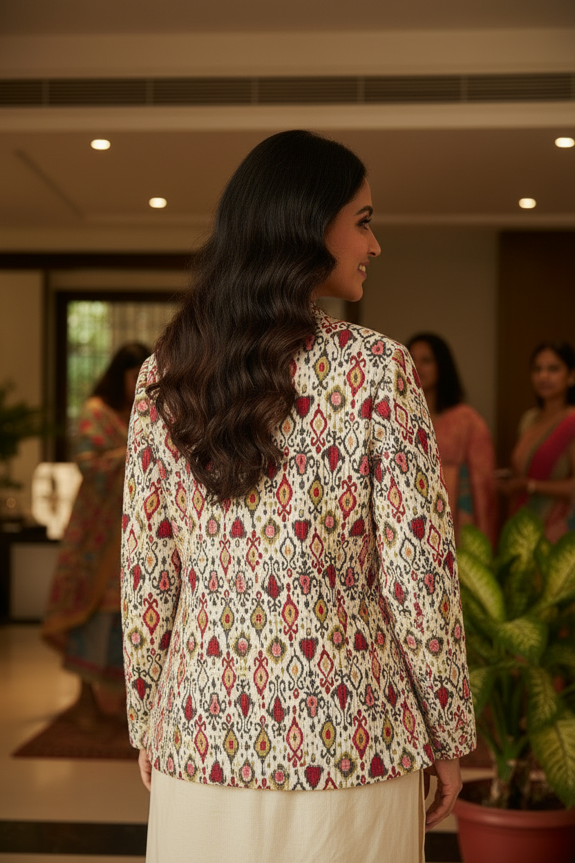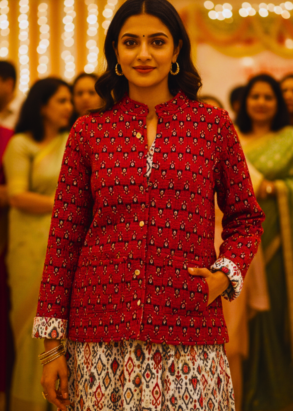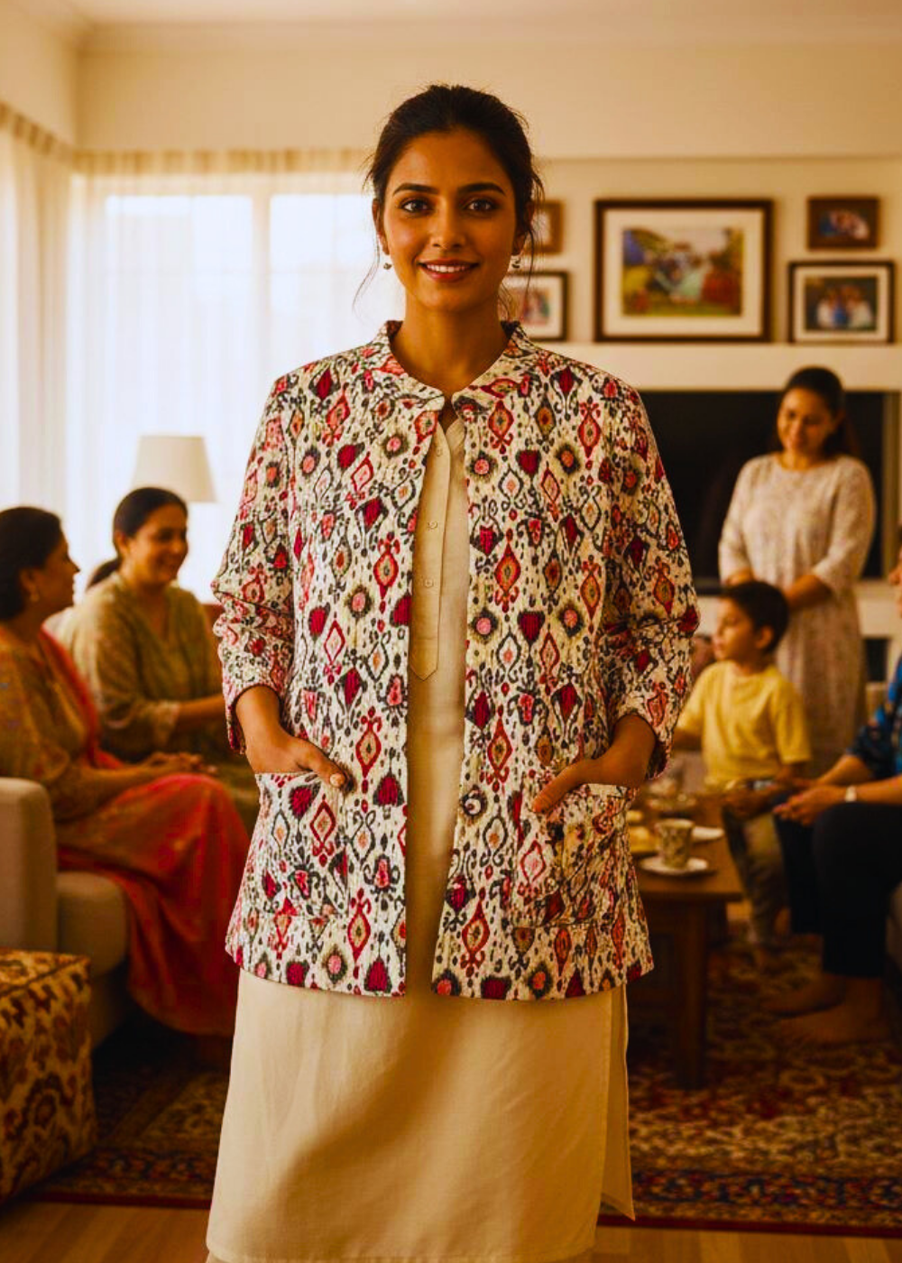Made from 100% breathable cotton, this jacket features soft quilting that keeps you cozy during mild winters while remaining light on the skin. The reversible design gives you two stylish looks in one jacket—perfect to pair with kurtis, dresses, or even casual outfits.